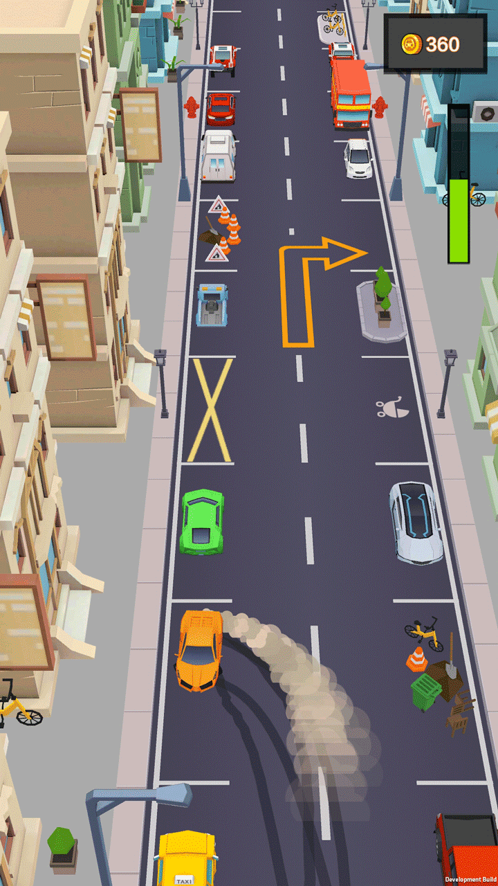 玩家通过控制高速行驶的汽车漂移停入到停车位当中,在停车过程中不能碰撞到其它物件、并且需要准确找到停车位。否则有可能会违规被警察盯上而结束游戏。每一个关卡设置通关分数,根据停入车位的标准程度会获得对应的分值,车辆也会有分值的大小哦。一起成为漂移停车高手吧!