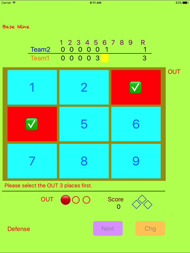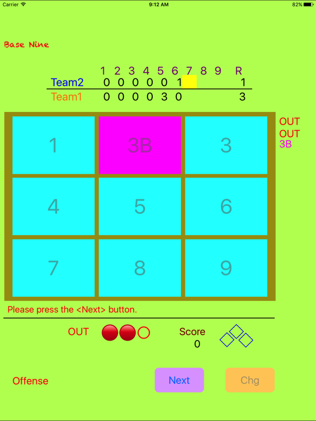 Base Nine游戏:棒球板式棒球比赛是一款小型运动游戏,可让您完全放松,它为您提供了非常逼真的棒球游戏,同时,您还可以与大家一起开发有趣的棒球比赛,让您享受真正的乐趣,是休闲时光的最佳选择之一!击球的结果,牌的“1”到“9”它将决定(命中,2B,3B,HR,OUT)。