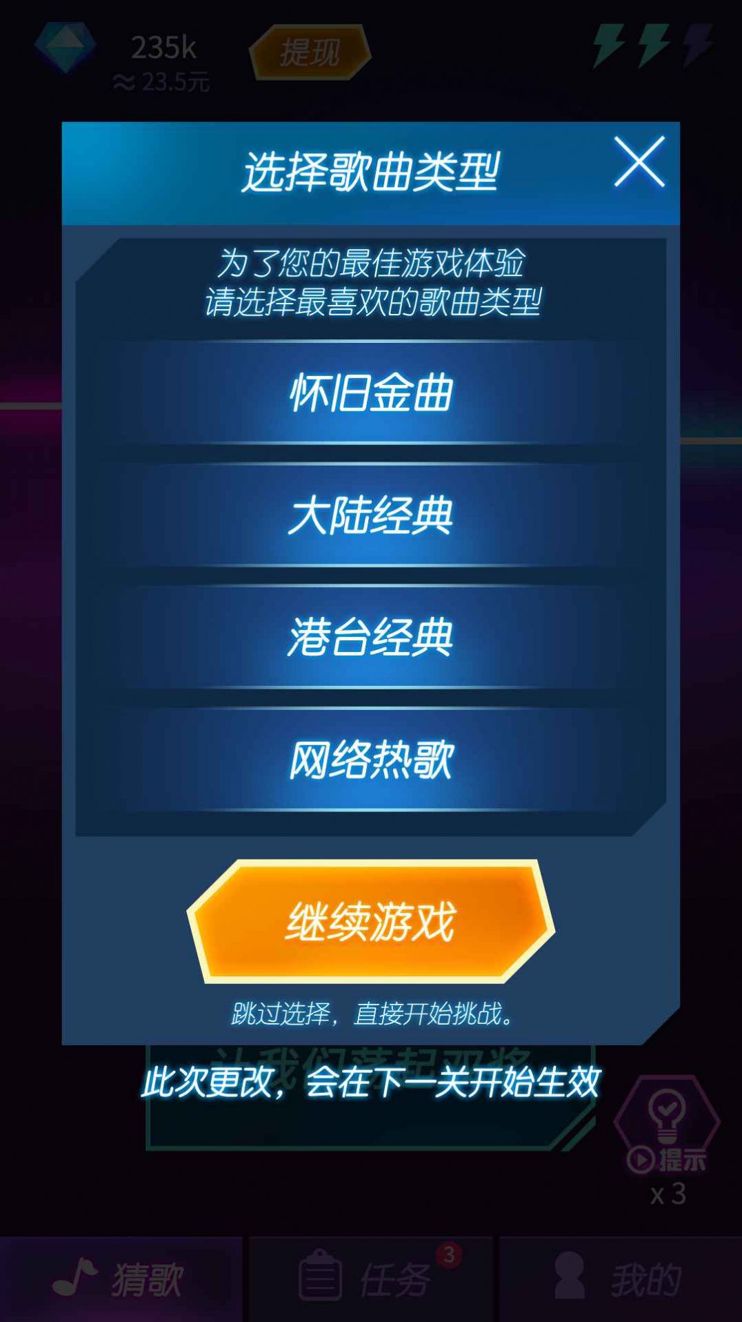 2、玩法很简单,就是从众多歌曲中选择一个开始听开头,多个选项中自由选择正确答案就行。