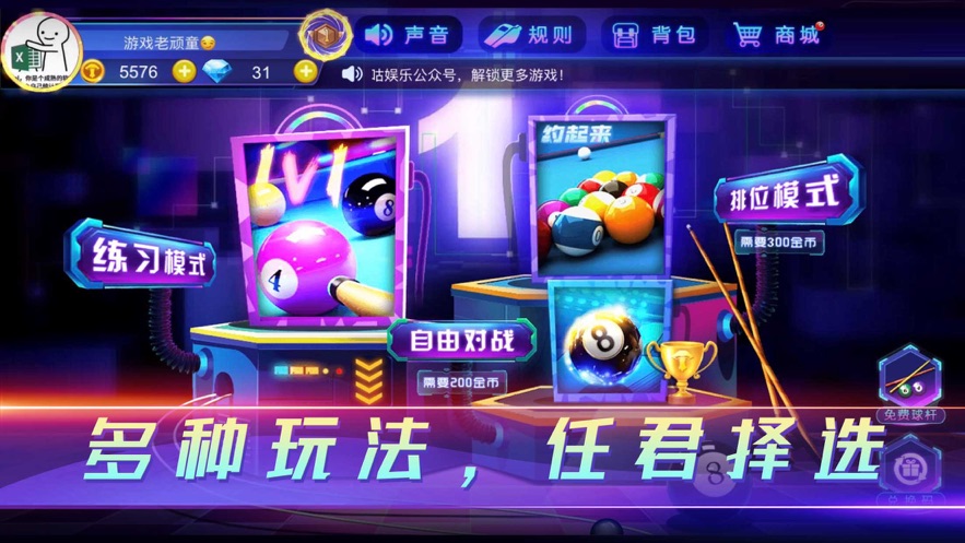 魔咕台球游戏这项体育项目已经在很多国家流行起来了,特别是其中的斯诺克更是被称为绅士的运动,国内目前比较流行的还是属于中式八球玩法,规则相信爱好者都不会太过陌生,去商店里购买一根好的球杆并选择球桌,1v1竞技对战、大型联赛和练习场这里都有,还有独特的残局玩法看看你控球的能力,2D模式易于上手,新手也能轻松打进球。