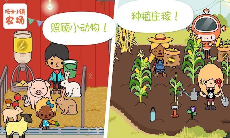 托卡小镇农场中的四个地点将为您带来农场故事的所有元素。去畜棚照看动物,给它们喂食后再帮它们清理便便!照顾完动物之后回到家中,饱餐一顿之后拿起班卓琴,来一次即兴表演。好好休息一晚,第二天再前往田地里照料庄稼。收获作物之后前往商店,卖掉食物之后可以制作新产品并购买商品!