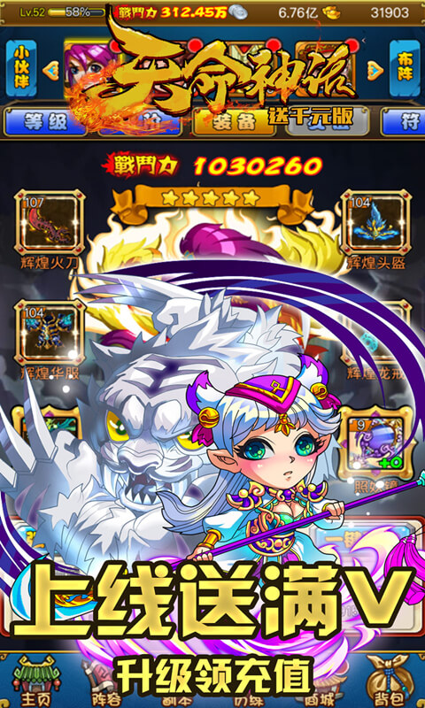 1、上线送满V,888w银币,48888元宝,13资质神族自选包*1