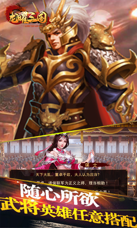 龙曜三国是一款全新的三国策略战争手游,全新的恢弘战场,惟妙惟肖的人物造型,玩法十分丰富独特,各具特色的华丽技能尽情释放,激烈的战斗场景让你享受万人同屏国战的乐趣!