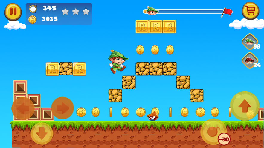 罗宾汉的森林世界是一款充满着经典元素的横版闯关类手游,罗宾汉的森林世界这款游戏整体的操作玩法也是十分的经典,玩家们通过简单的双手控制就可以进行上手操作。整款游戏有着非常多的关卡和不同的任务等着你来一一挑战和解锁。