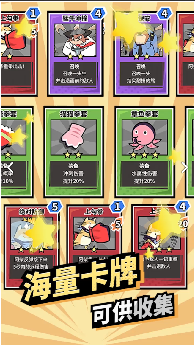 柴犬侠手游下载是一款以热血拳击的卡牌对战游戏,玩家可以将卡牌组建战队,也可以随机抽卡牌,游戏中采用独特的狗狗题材玩家在游戏中可以看见各种类型的狗狗大侠进行冒险,萌萌柴犬,化身城市的保护者。拳拳到肉,策略卡牌也能充满打击感。随心换装,趣味造型任意搭配。