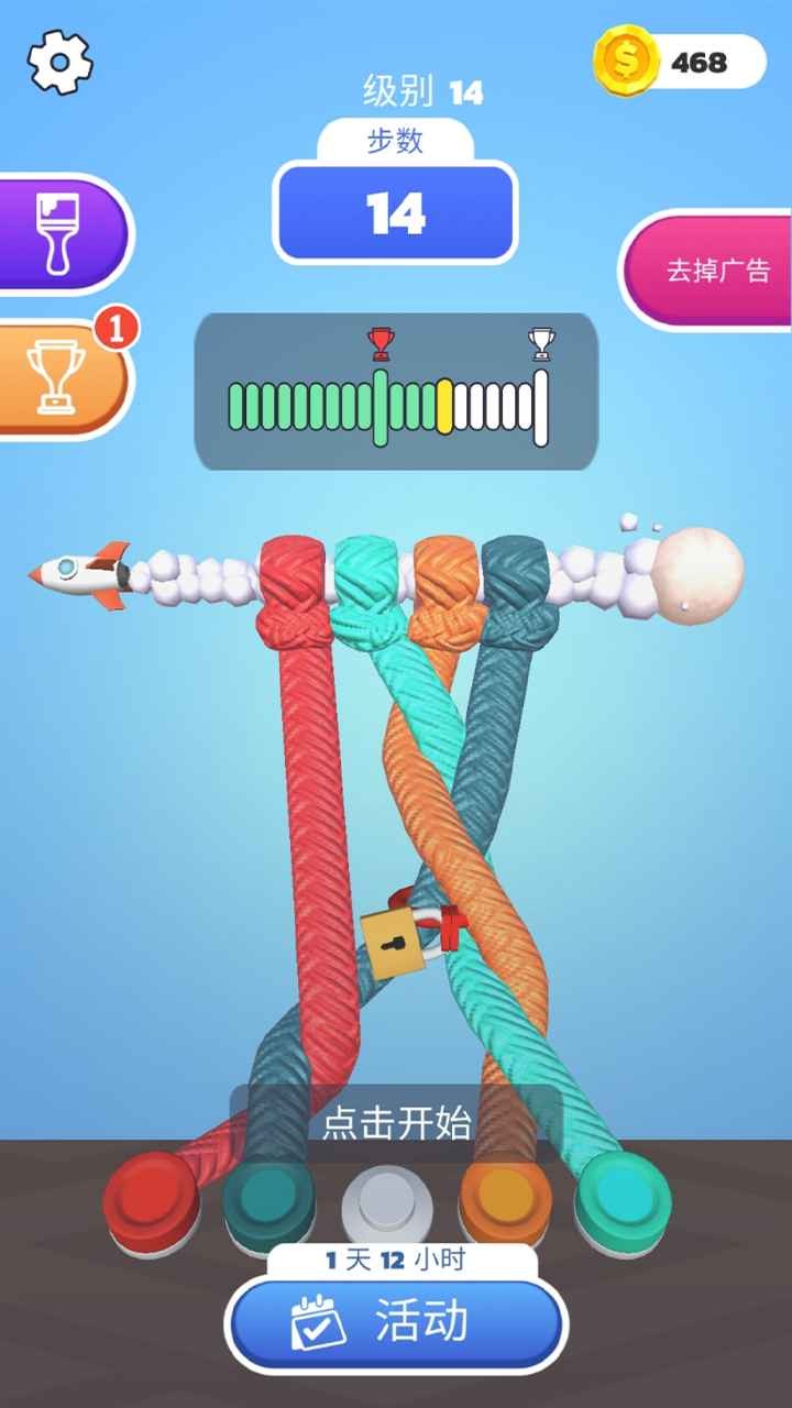 1、彩绳解解乐游戏成为最强的解绳大师吧,在复杂的缠绕,都会在你的努力下解开;