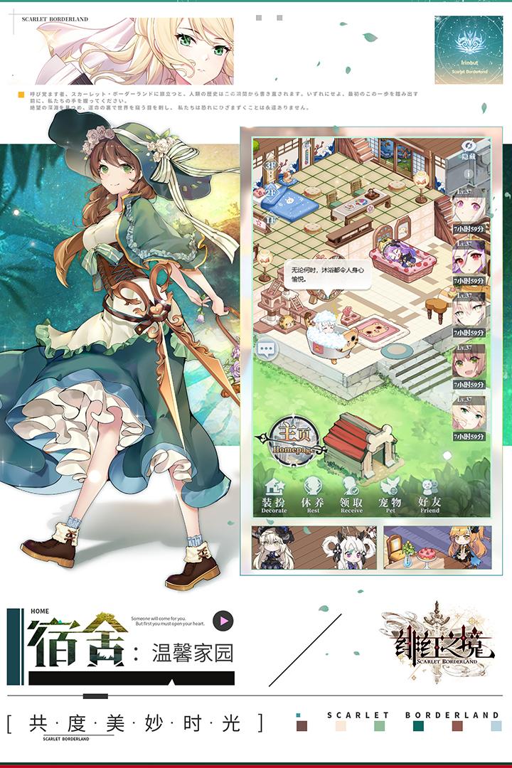 在游戏中,我们设计的据点系统将会给玩家提供一个可以与角色进行多样互动的场所。每一名角色都设计了丰富的动作表现与妙趣横生的对话,让不同的少女在这里展现出只属于自己的一面。同时玩家还可以扩建宿舍,改变样式,体验不同的风格带来的不同效果。想要看看被“拎起来”的少女有何反应?那就来尝试一下吧。与此同时,据点内还会有众多的道具、家具随你搭配,远征所也会为你提供更多丰富的资源,帮助你更好的探索绯红之境的世界。