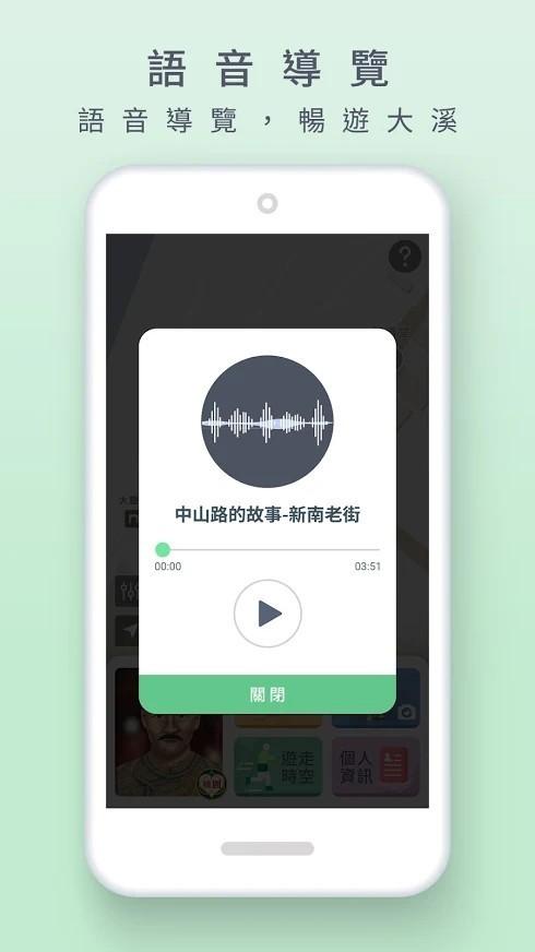 2、导览地图,包含景点介绍、GPS定位、语音导览、交通资讯等一应俱全,是你游玩大溪的最佳选择。