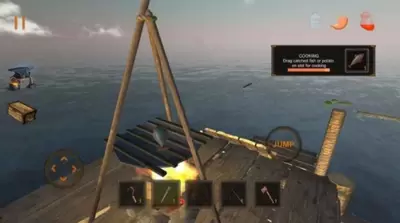 2,造一个逃生筏,航行你的筏子到新的地方,使用飞索去钩住漂浮的海上残片,制作建造生存装备,武器,作物地块等等等。