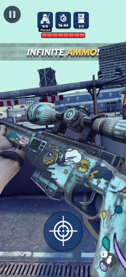 2、按住并拖动狙击镜瞄准,释放并射击,瞄准您的狙击范围,并尽力而为;