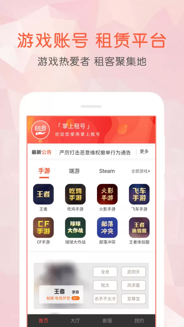 英魂之刃租号APP是一个为游戏玩家出示高档游戏账号感受服务项目的租号服务平台,