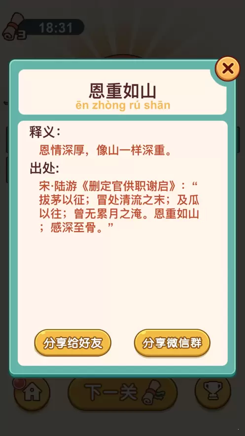 4、我们在休闲娱乐的同时还可以积累更多的知识,每个成语都有注释;