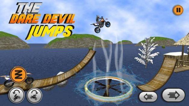 2、用不同位置的断桥去进行飞跃,控制好摩托车的重心,安全的落地保持领先。