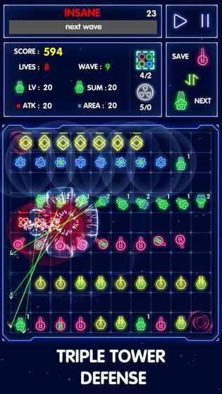 三消塔防是一款将策略与塔防完美结合的休闲益智游戏,三消塔防有着极其炫酷的画面效果,霓虹灯元素加上几何造型,让这款游戏充满现代感与动感!多样的塔防单位选择,通过三消来进行各种进攻或者升级!超多敌人等你来消灭!敌人也分很多类型哦!开动你的大脑吧!