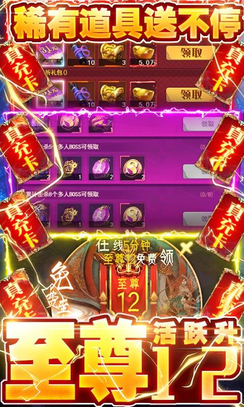 1,上线赠送至尊10,元宝18888,铜币999w,千元充值卡包,称号:无限送充值
