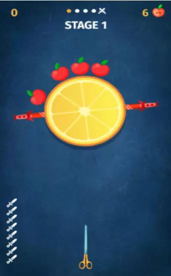 1、点击以扔刀并击中目标,砍苹果以赚取更多金来解锁刀具。