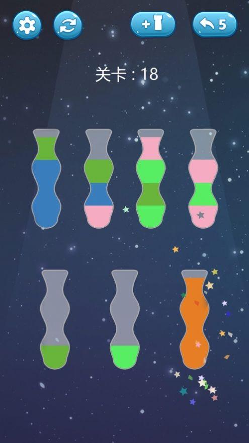 1、轻击水瓶即可开始游戏,只有相同颜色且有足够空间才能开始倒沙;