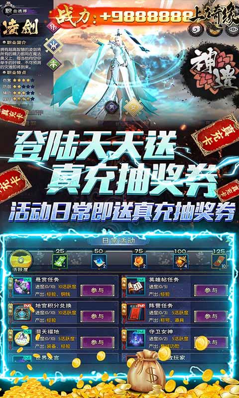 《上古奇缘》是一款以盘古开天后人妖仙魔九界共存为背景的古神话题材ARPG,丰富的剧情,极具代入感的故事背景开启古神话世界,该游戏为全新重置版,经典与创新的结合玩法,新增充值卡活动让你在游戏中征战古神豪不费力。★每日上线领真充抽奖券★升级送充值★BOSS爆充值。一切为了增强您的游戏体验,玩游戏根本不用花钱。快来感受中国特色的古神世界。