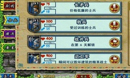 每场战斗结束后都会获得金币,金币除了可以建造防御设备和招募士兵以外,还可以用于新兵种和设备的解锁和升级,从而增加士兵和建筑的属性。本作的强化系统比较单一,只是对单个兵种或建筑进行强化,选择难度不大。但是强化对防守的作用还是很明显的,玩家可以自由强化士兵和设备,用来缓解守护城堡的压力。