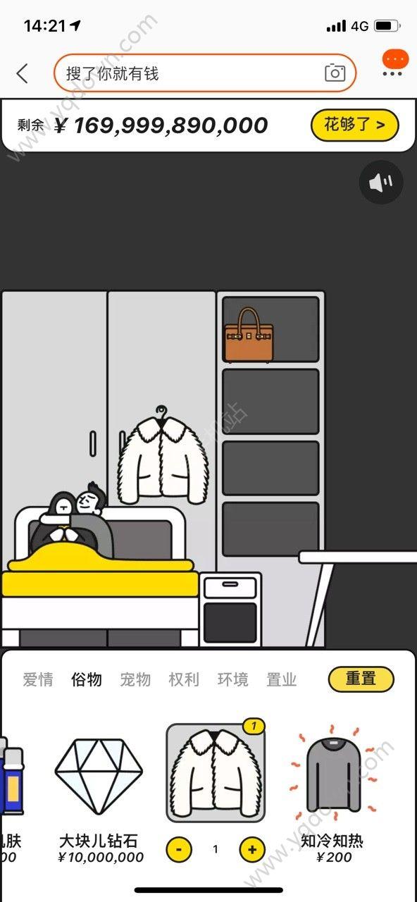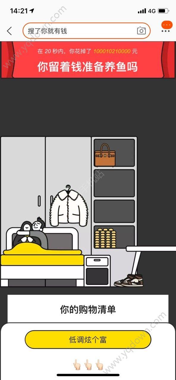• 搜了你就有钱小游戏跟之前爆火了的一段时间的“花光比尔盖茨的钱”游戏差不多,但是这里的金额好像更高,还是在淘宝里边直接进行,各种东西都能让你自由购买。哈哈,这简直就是2020年的一个大惊喜啊,没想到这么快,你就有机会体验一次有钱人的感觉了。