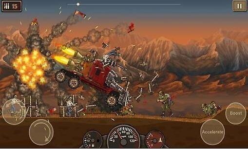 2、如脱缰的马一样猛,驾驶车辆在大荒原上闯关,打造一部杀戮机器,冲向那些僵尸;
