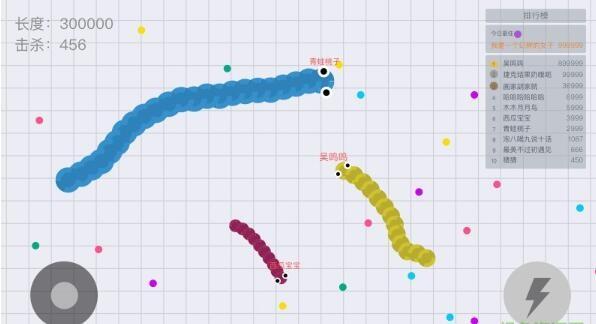 控制摇杆走位你的小蛇,吃掉地图上彩色的小圆点,就会变长。