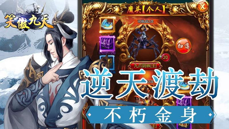 1、笑傲九天是一款国风仙侠类RPG游戏。游戏为玩家呈现了一个恢弘的奇幻世界,玩家在这里,可以自由的闯荡副本地图,夺取神备和资源,为玩家带来不一样的游戏体验。喜欢仙侠游戏的你,怎么能错过,快来下载吧