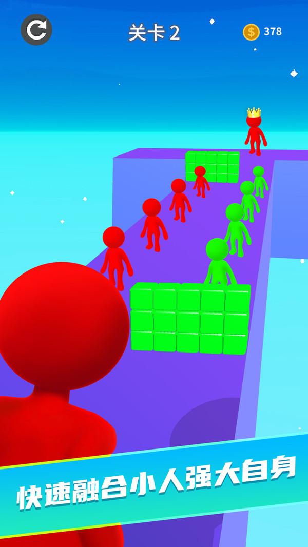2、很多果冻人等着玩家去收集,合并和玩家一样颜色的果冻恶棍,把玩家自己变成一个强大的巨人;