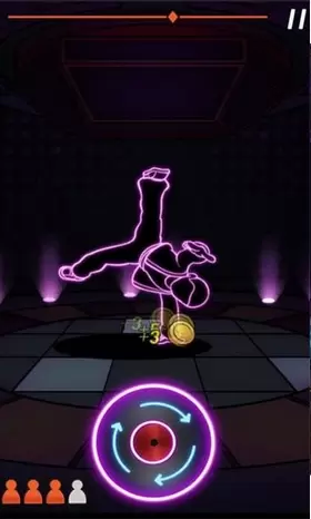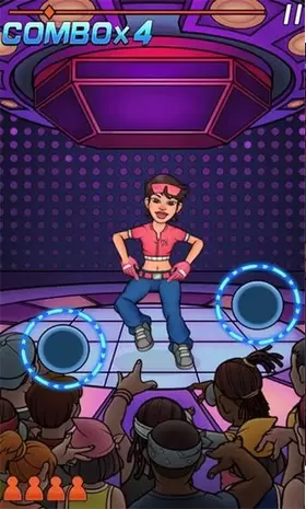 2,随着激情动感的音乐舞动你的脚步,体验有趣的街舞,您需要跟着音乐的节奏及时正确操作,得到更高的分数。