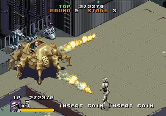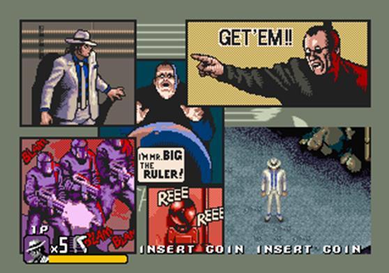 街机版<月亮步>大概是除MD版外,唯一一部值得一玩的杰克逊游戏了,不过它比MD版还要差点.本作的类别介于射击游戏与动作清版游戏之间,幸运的是,MD版的绝大部分出彩要素都被沿用.默认值下,按住开火按钮可以放出电荷杀死敌人.你依然可以引诱敌人跳舞,只不过这次不再耗费你的生命槽,而且还能通过营救小孩获得补充.当你找到Bubbles后,你会变身为一个机器人,换用导弹与激光来消灭敌人。本作采用了传统了斜45度视角,同时可三人同玩(2p和3p分别是穿着红色与黑色西装的杰克逊).游戏中很多关卡的主题都是重复的,只是顺序稍微有点变化.乐曲也有很多重复,可品质并没有多少提升.毫无疑问,这是画面最好看的一部杰克逊游戏.游戏在不经意间流露出不少闪动之处,每关一开始,都配有几幅有趣的漫画桥段,以及一幅标有所有人质方位的地图.在一些场景里,迈克尔还会向Mr.Big发出他那标志性的WOOO~吼声,就像狗在对敌人狂吠般——类似的场景在MD版中也曾出现过.迈克尔转变为机器人形态的过程看了让人直起鸡皮疙瘩——首先,迈克尔的身体会增大成一个巨大的畸形体,然后变为金属,再然后缩为标准尺寸.只是"需要找到Bubbles才能变身"这样的设定本身似乎并没有多少道理.有意思的是,到达墓地后,Mr.Big会?鲆痪渚镆舨裳某胺砘坝?"我真的太爱你了,迈克尔!"