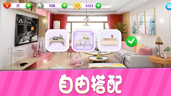 3、自由搭配房间里的装饰,什么沙发、电视剧、窗帘等都能自定义。