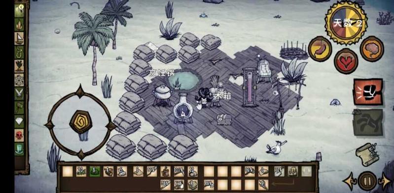 第三天就是探个图找一个合适的地方安家了,然后找金子把二本搞出来,我推荐你们在有蜘蛛窝的岛建家,这样不缺怪兽肉和蜘蛛网了,看见鱼子一定要捡,别吃,做鱼场,尽量做多些,这样用两块肉(是肉就行怪物肉也可以),两条鱼就可以做海鲜大排档了,加60血和30san,很强。