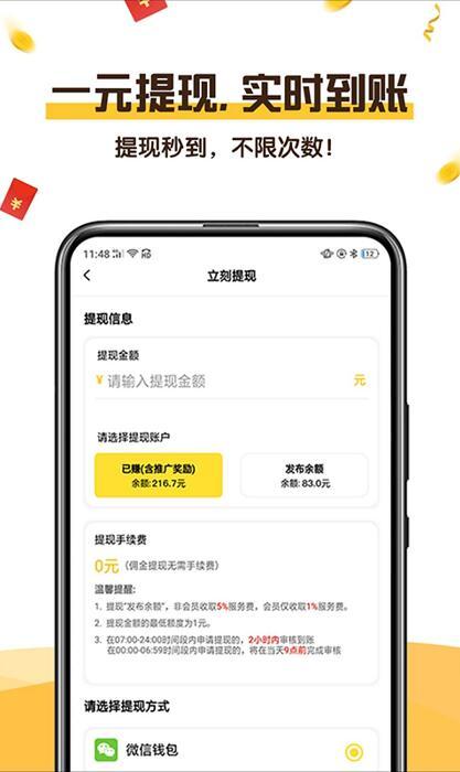 1、新手福利做任务拿红包赚更多,满1元就能提现支持微信,7点至24点2小时内到账,0点至6点59当天9点前到账。