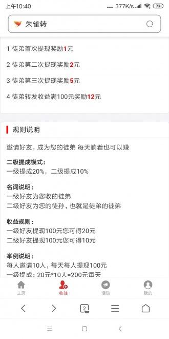 朱雀赚app是最新上线的转发文章赚钱平台,用户可以通过朱雀赚app赚零花钱,目前朱雀赚app属于网页版本的转发软件,暂时没有app,所以用户只能安装软件后,收藏起来,方便以后使用。