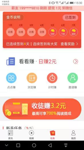 薪头条APP,让资讯阅读变得更有价值,等你来赚!新手下载安装立马可提现0.3元。完成新手任务有额外奖励红包。永久1元提现到微信、支付宝钱包1天内到账。用邀请码收徒,自动绑定师徒关系,收徒赚3.2元,享最高700%徒弟阅读提成,每邀请一位徒弟奖励30000金币!金币可以兑换成零钱,立即提现!