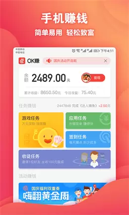 在OK赚平台下载推荐的手机游戏和应用,并试玩体验一定时间,就能获得相应的奖励。