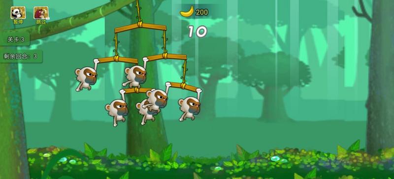 3、动作闯关游戏,每个关卡内都会出现不同性格的猴子,会为猴子提供一个吊篮似的闯关工具,随时出现的敌人要利用香蕉的出现,去击败敌人,游戏的操作非常的简单,玩家操作猴子使用香蕉去攻击敌人,只要被香蕉击中,敌人就会被淘汰,你就会获得最后的胜利,喜欢的玩家快来下载