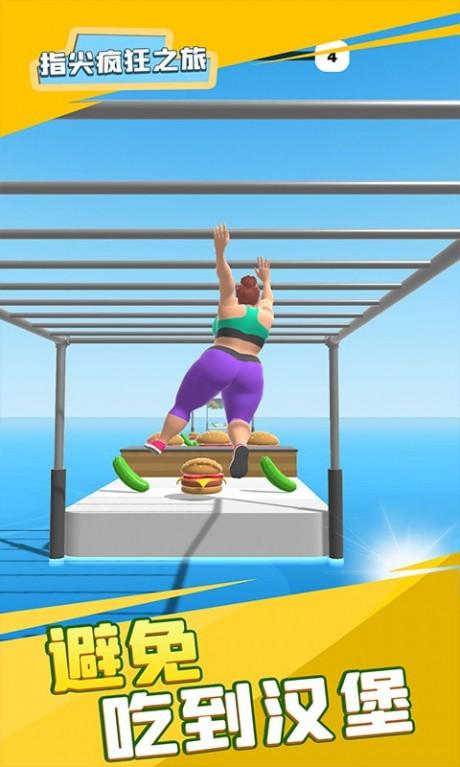 指尖疯狂之旅是一款欢乐的3D闯关游戏,画面设计简约清新,机关设置种类新颖奇特,作为一名两百多斤的胖子,你必须坚决抵制汉堡炸鸡,尽量使用健康的绿色蔬菜。减肥是你的最终目标,要想瘦成一道闪电,自律十分重要,如果你在终点不能减肥成功,就无法成功通关。
