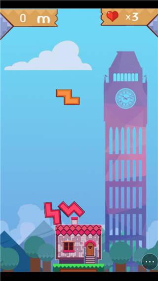 点击方块变换形状落下到房子上,不要让方块掉下去。