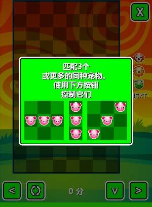 游戏玩法:可以通过下方四个按键来控制宠物移动及位置的变换,但三个以上宠物相连时即可消除