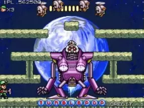 DATAEAST公司的作品,吸尘器小子,当初就是因为雪人兄弟实在太火了,DATA EAST公司有点红眼,于是模仿雪人兄弟的类型,制作出了这款游戏,值得一提的是他的续作Diet gogo更加好玩,估计下一个版本就支持了。这款游戏上手很容易,难度不算太大,3个币左右就可以练出不错的水平来。由于刚开始可以选关,一般都先选最难的地带啦,应该是那个阿拉伯地区吧,这样难度就更降低了,总之机厅一币通的很多。