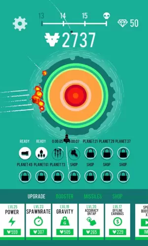 星球轰炸机无限钻石版是一款休闲射击游戏。游戏中玩家需要通过自己的操作和智慧来快速摧毁关卡中的星球,享受轰炸破坏的极致乐趣,游戏非常的简单炫酷,你还可以使用金币来解锁你的武器系统以获得更高级的武器。而且离线也会为带来不错的收益,休闲的画风个性的关卡玩家只管收集你的武器体验轰炸射击的快感,不断解锁丰富的关卡让你快速的上手,完成一系列星球关卡挑战,玩家们需要运用自己的智慧和策略完成任务。丰富的游戏场景和游戏关卡给玩家畅爽游戏体验,更多精彩,等你来玩。