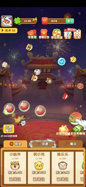 简单讲述一下阿伟弹力球的玩法,我们登录app之后,点击解锁小脑斧等萌宠,萌宠们会自动攻击上面的弹力球,升级萌宠可提升攻击力,点击加速能使萌宠飞行速度、攻击和伤害翻倍,每消灭一屏弹力球算闯过一关,然后自动挑战下一关。