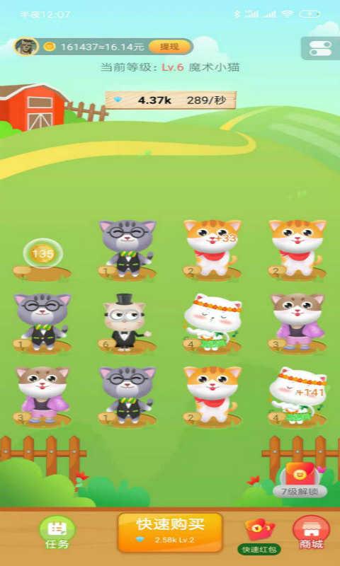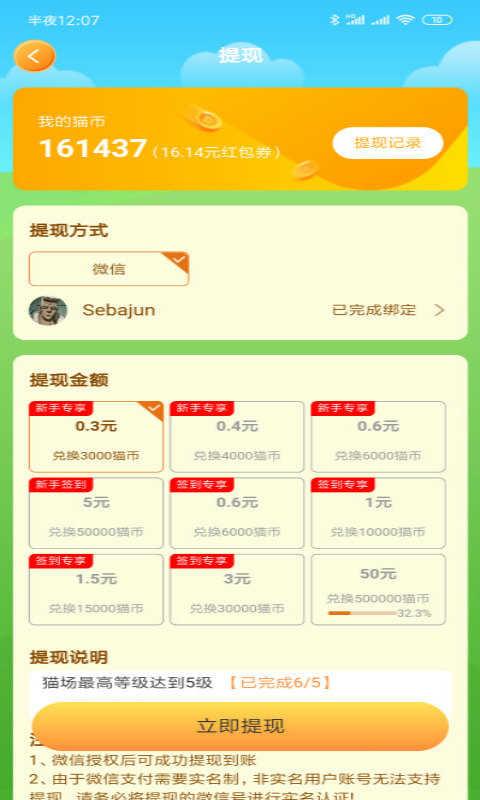 猫咪每次升级都有红包,不卡阶段不卡提现金额,一元可以反复提现无任何限制!