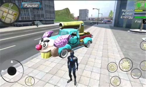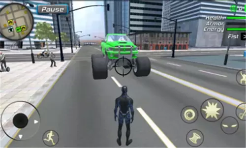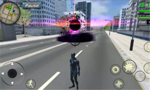3、运用你的超能力在城市中进行自由的巡视冒险,展示你强大的实力来消灭更多敌人们;