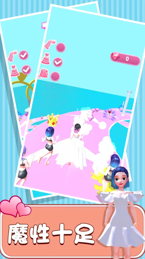 1、颠覆传统的跑酷模式,扮演小姐姐与其他的小伙伴进行比拼,路途中收集美丽的服装以及道具;