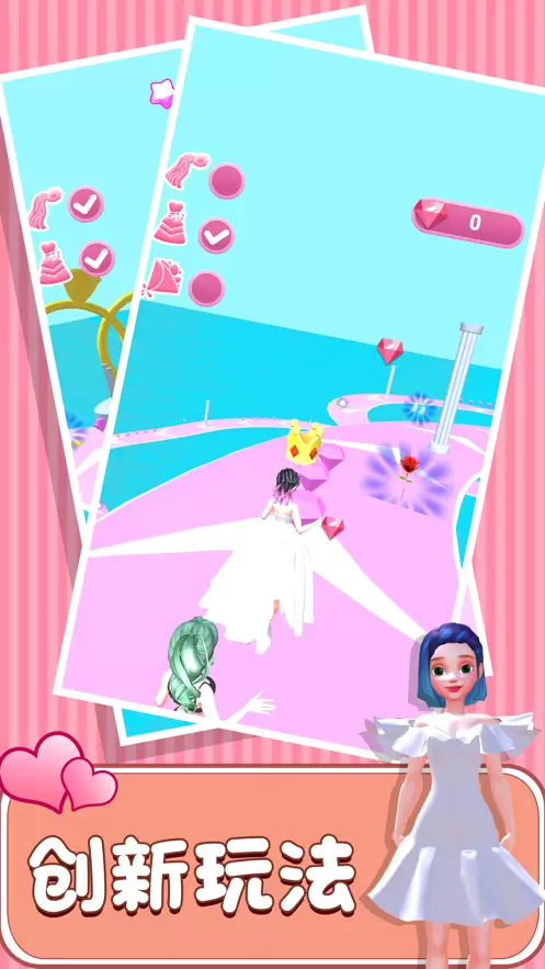 恋爱跑酷大作战游戏是一款非常有趣的跑酷闯关游戏。超级浪漫的游戏氛围,身着婚纱一路跑酷,收集各种浪漫的道具,以最美丽的形象抵达终点见到自己的白马王子,还能解锁非常多不同造型的婚纱,赶紧下载游戏体验这场奇妙的婚礼冒险吧!