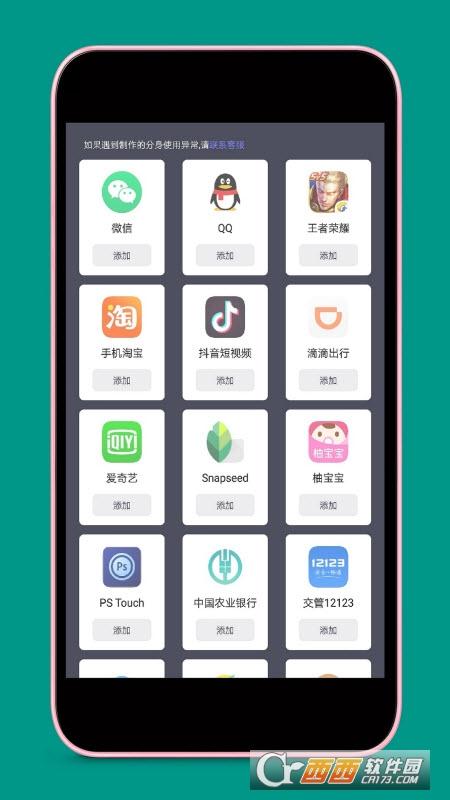 作为全球首 款应用分身大师,免费支持微信分身、微信双开、QQ双开、派派双开,陌陌双开、淘宝双开、天猫双开、京东双开、支付宝双开、微博双开、全民小镇双开等几乎所有应用的双开分身,解决用户多账户需求。