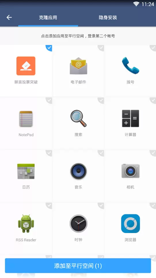 平行空间精简版,一款优质的应用多开工具,能够无限克隆各种应用,轻松实现应用、游戏的多开,互不干涉,简单实用。软件运行稳定,安装包小巧,界面整洁,带给您更加舒适的多开体验。