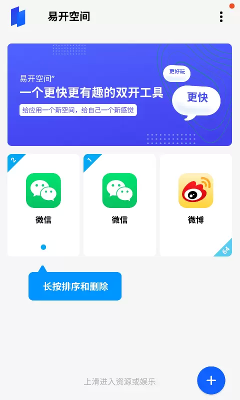 易开空间app是一款手机应用游戏双开工具,易开空间app支持多种应用游戏,极速克隆双开,操作流畅,界面清爽,为用户带来更便捷的应用双开体验。一个更快、更有趣的双开工具,给应用一个新空问,给自己一个新感觉。